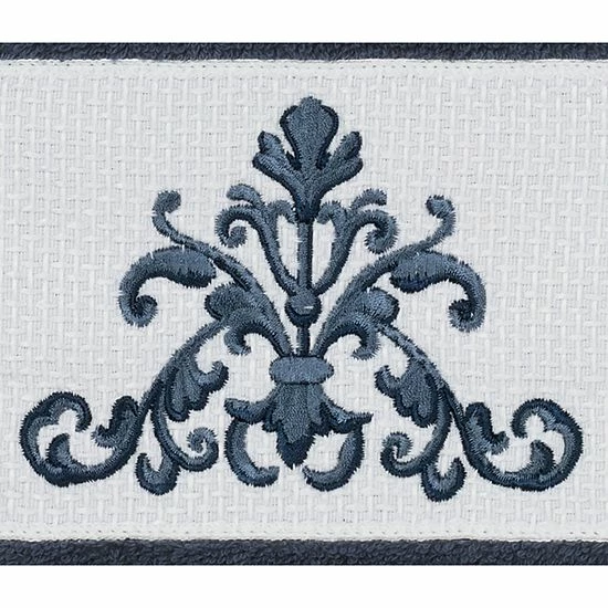 - Features an elegant scrolling crest motif on a textured woven border