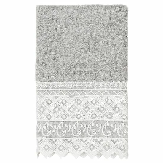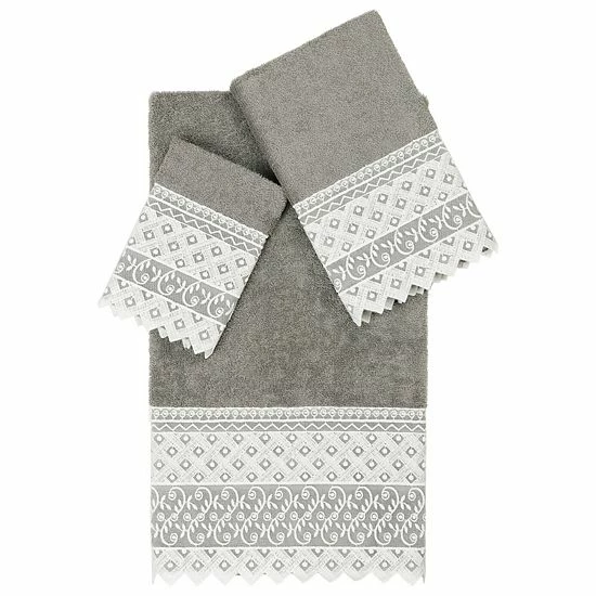 - The AIDEN Lace Towel Collection features an intricate floral trellis motif, embroidered on a white organza lace border with scalloped bottom edge. These soft and luxurious towels are made of premium Turkish Cotton and offer lasting absorbency and superior durability.
