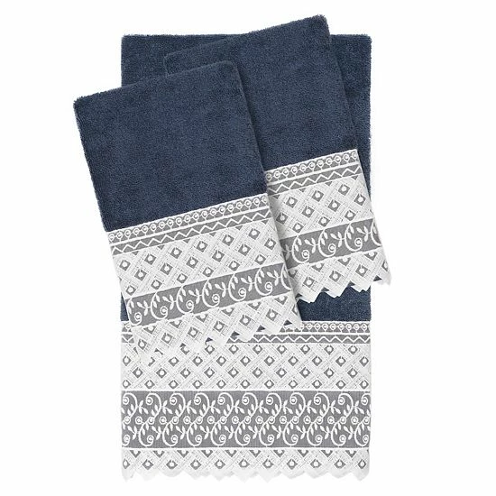- The AIDEN Lace Towel Collection features an intricate floral trellis motif, embroidered on a white organza lace border with scalloped bottom edge. These soft and luxurious towels are made of premium Turkish Cotton and offer lasting absorbency and superior durability.